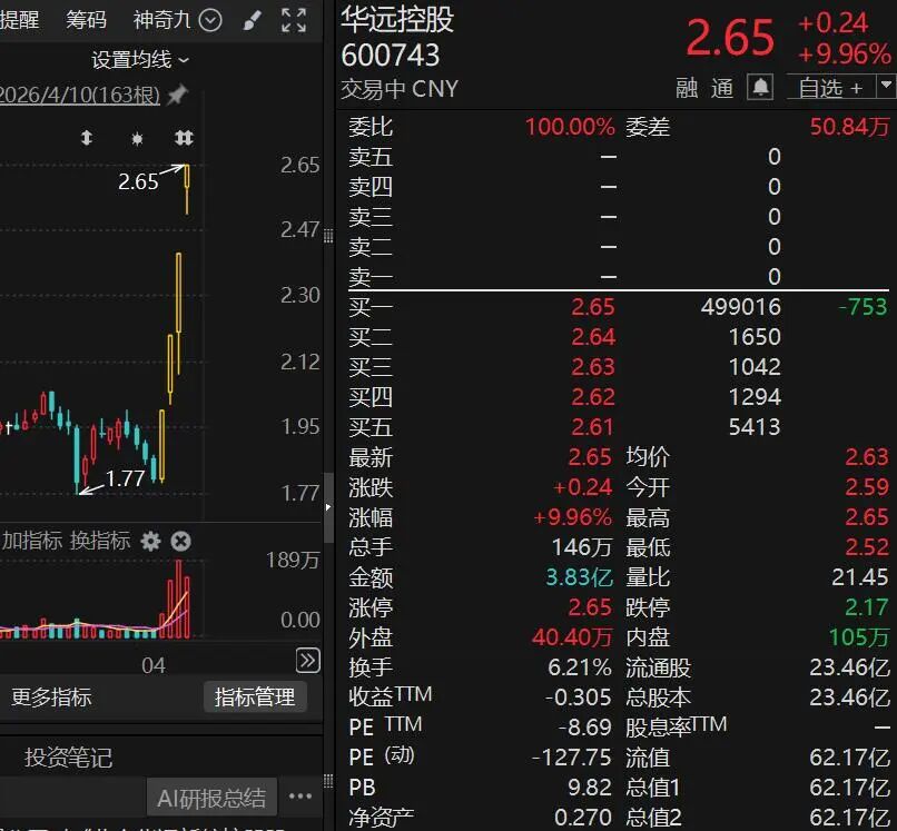 华远控股(600743)开盘涨停走出4连板,报2.65元/股,市值62.17亿元。
