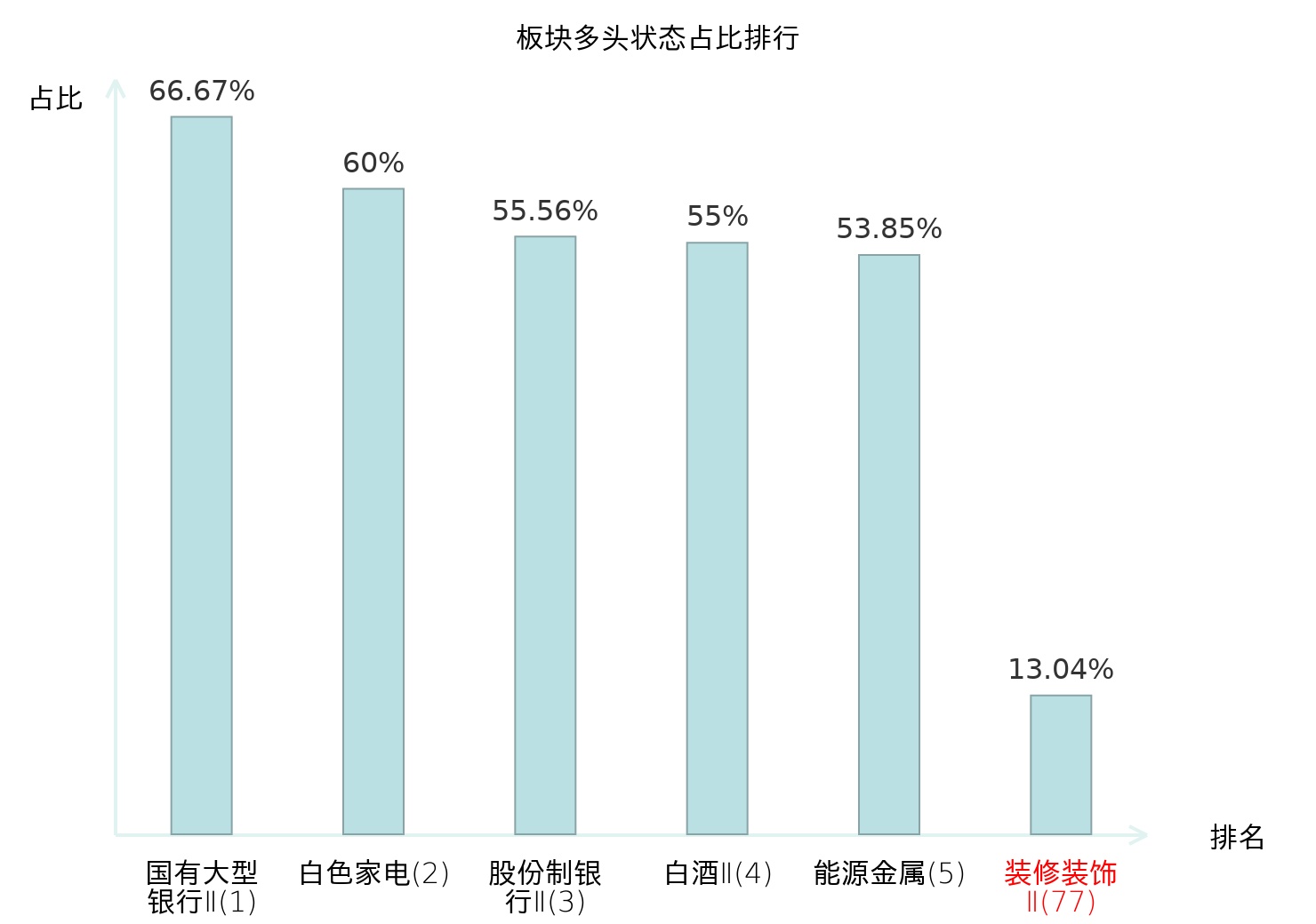 全市场所有行业板块中主力多头状态占比排名中,国有大型银行Ⅱ板块位居第一。林业Ⅱ板块名次提升最快,较昨日上升99位。