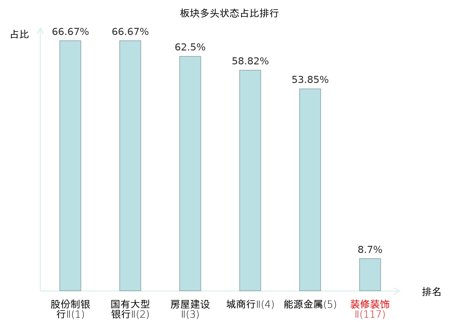 全市场所有行业板块中主力多头状态占比排名中,股份制银行Ⅱ板块位居第一。航空机场板块名次提升最快,较昨日上升68位。