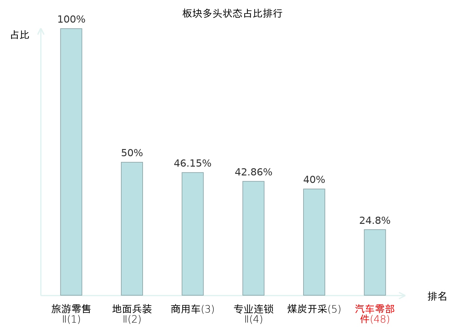 全市场所有行业板块中主力多头状态占比排名中,旅游零售Ⅱ板块位居第一。汽车服务板块名次提升最快,较昨日上升83位。