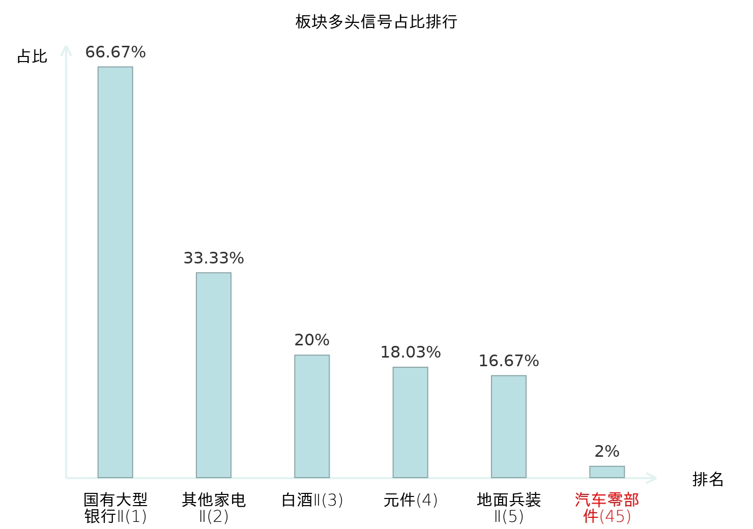 全市场所有行业板块中主力多头信号占比排名中,国有大型银行Ⅱ板块位居第一。其他家电Ⅱ板块名次提升最快,较昨日上升127位。