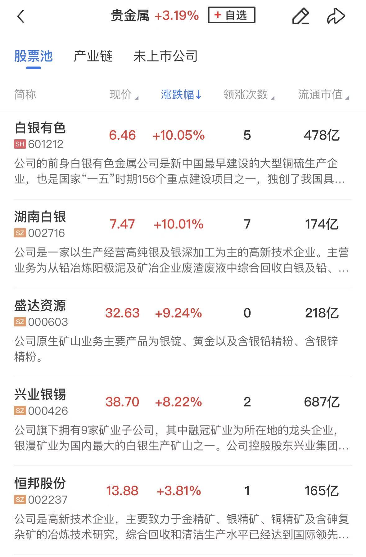贵金属板块持续走强,白银有色、湖南白银双双涨停,盛达资源,豫光金铅、兴业银锡等个股涨幅居前。消息面上,沪银期货主力合约日内涨超10%,现报19937元/千克,再创新高。现货白银再度涨超1%,报80.16美元/盎司,早盘一度跌超5%。