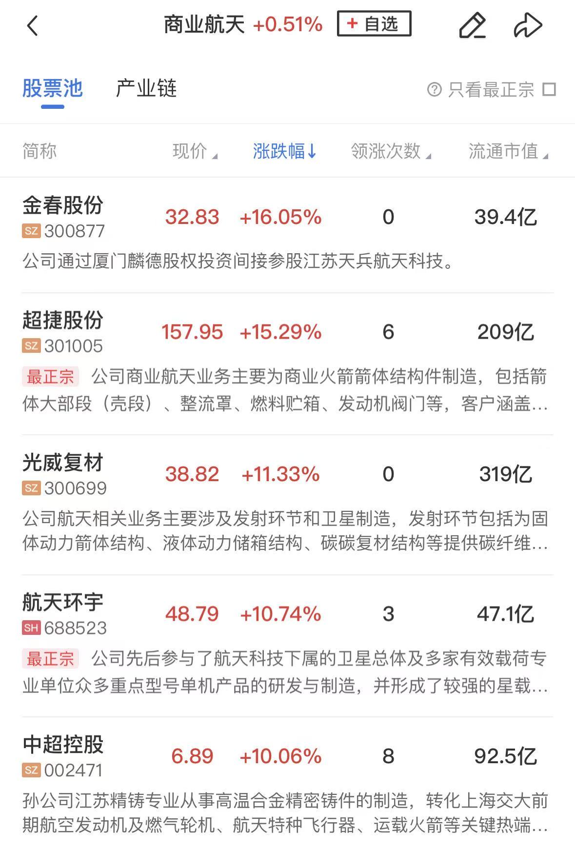 板块上,商业航天板块延续强势,神剑股份、中超控股、航天发展、金风科技等个股涨停,超捷股份、航天环宇、斯瑞新材、航天宏图等个股涨幅居前。