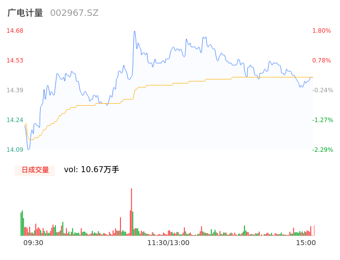05月15日,广电计量收报14.45,股价涨幅0.21%,成交金额1.54亿元,换手率2.11%。