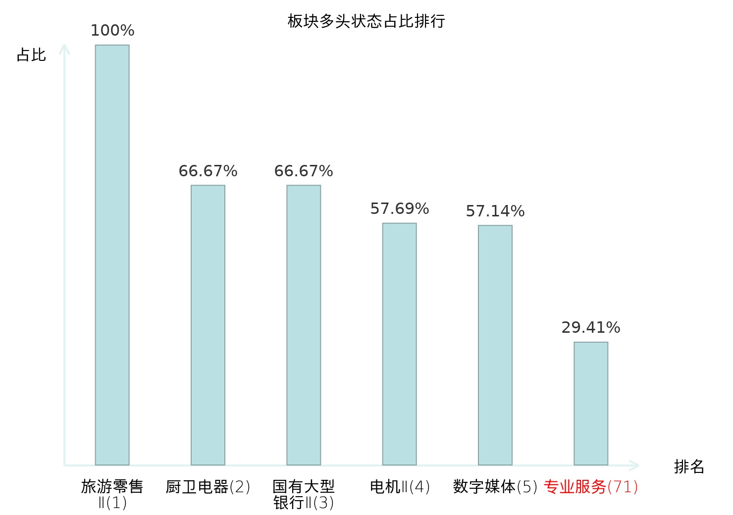 全市场所有行业板块中主力多头状态占比排名中,旅游零售Ⅱ板块位居第一。汽车服务板块名次提升最快,较昨日上升70位。