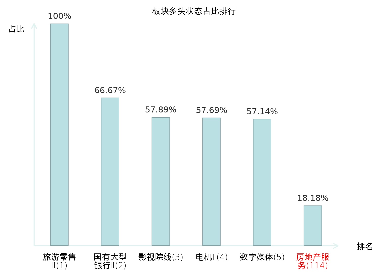 全市场所有行业板块中主力多头状态占比排名中,旅游零售Ⅱ板块位居第一。专业连锁Ⅱ板块名次提升最快,较昨日上升56位。