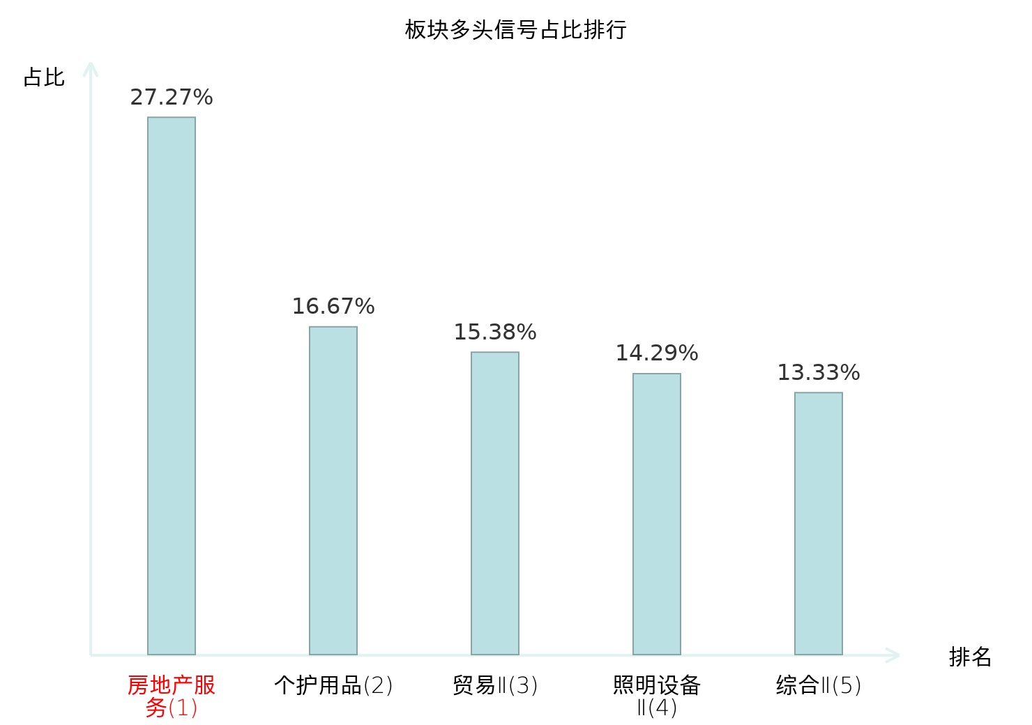 全市场所有行业板块中主力多头信号占比排名中,房地产服务板块位居第一。房地产服务板块名次提升最快,较昨日上升116位。
