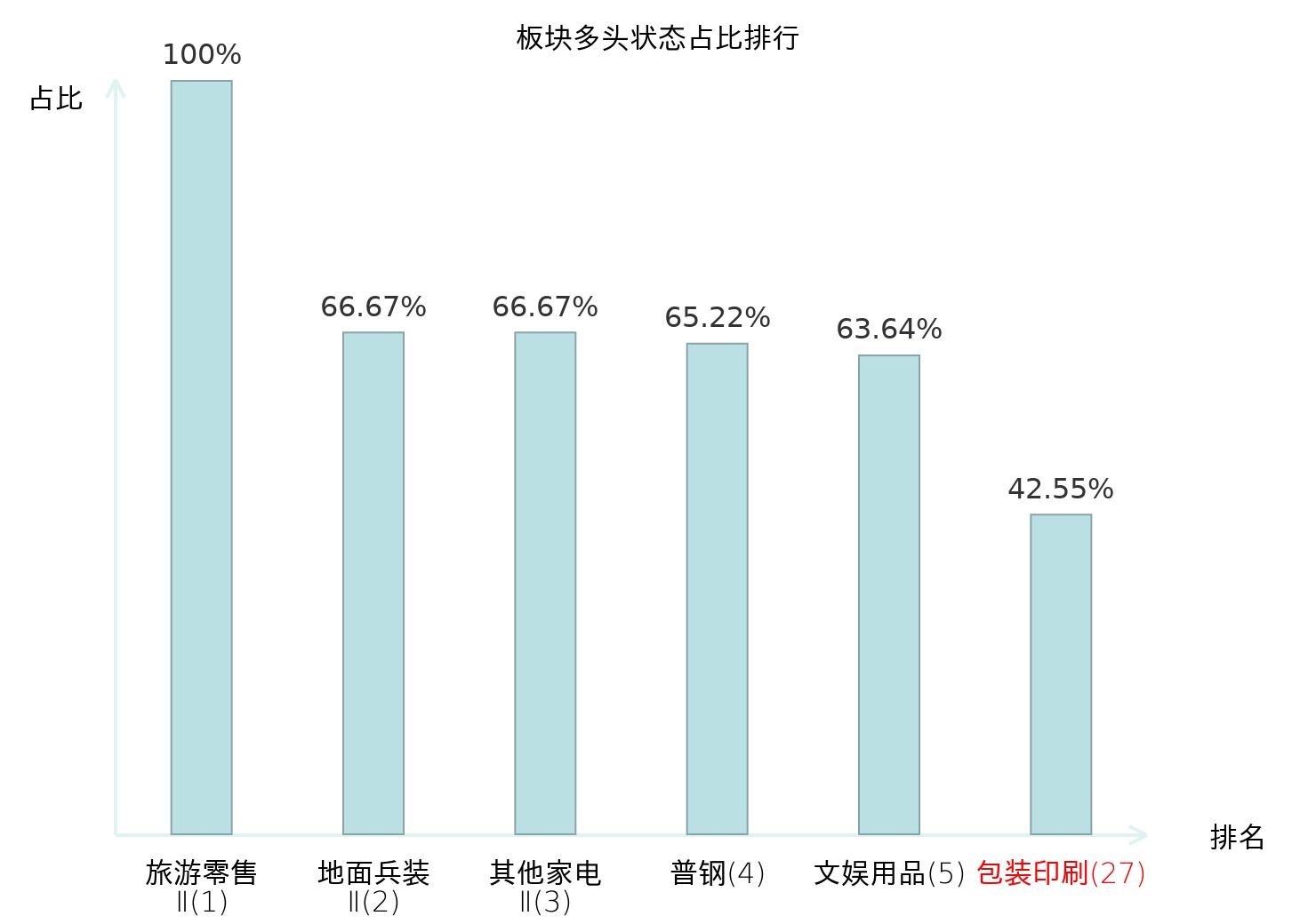 全市场所有行业板块中主力多头状态占比排名中,旅游零售Ⅱ板块位居第一。农商行Ⅱ板块名次提升最快,较昨日上升95位。