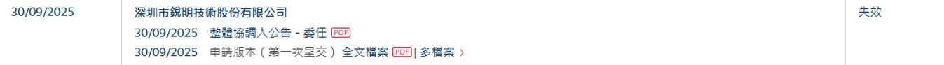 智通财经APP获悉,深圳市锐明技术股份有限公司(锐明技术,002970.SZ)于2025年9月30日所递交的港股招股书满6个月,于2026年3月30日失效,递表时中金公司为其独家保荐人。