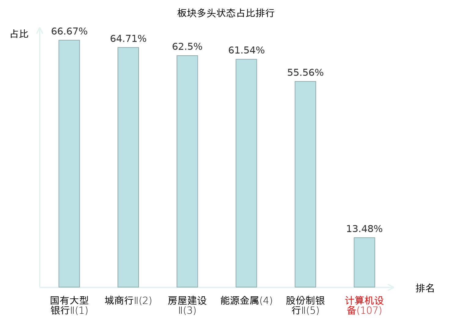 全市场所有行业板块中主力多头状态占比排名中,国有大型银行Ⅱ板块位居第一。普钢板块名次提升最快,较昨日上升65位。