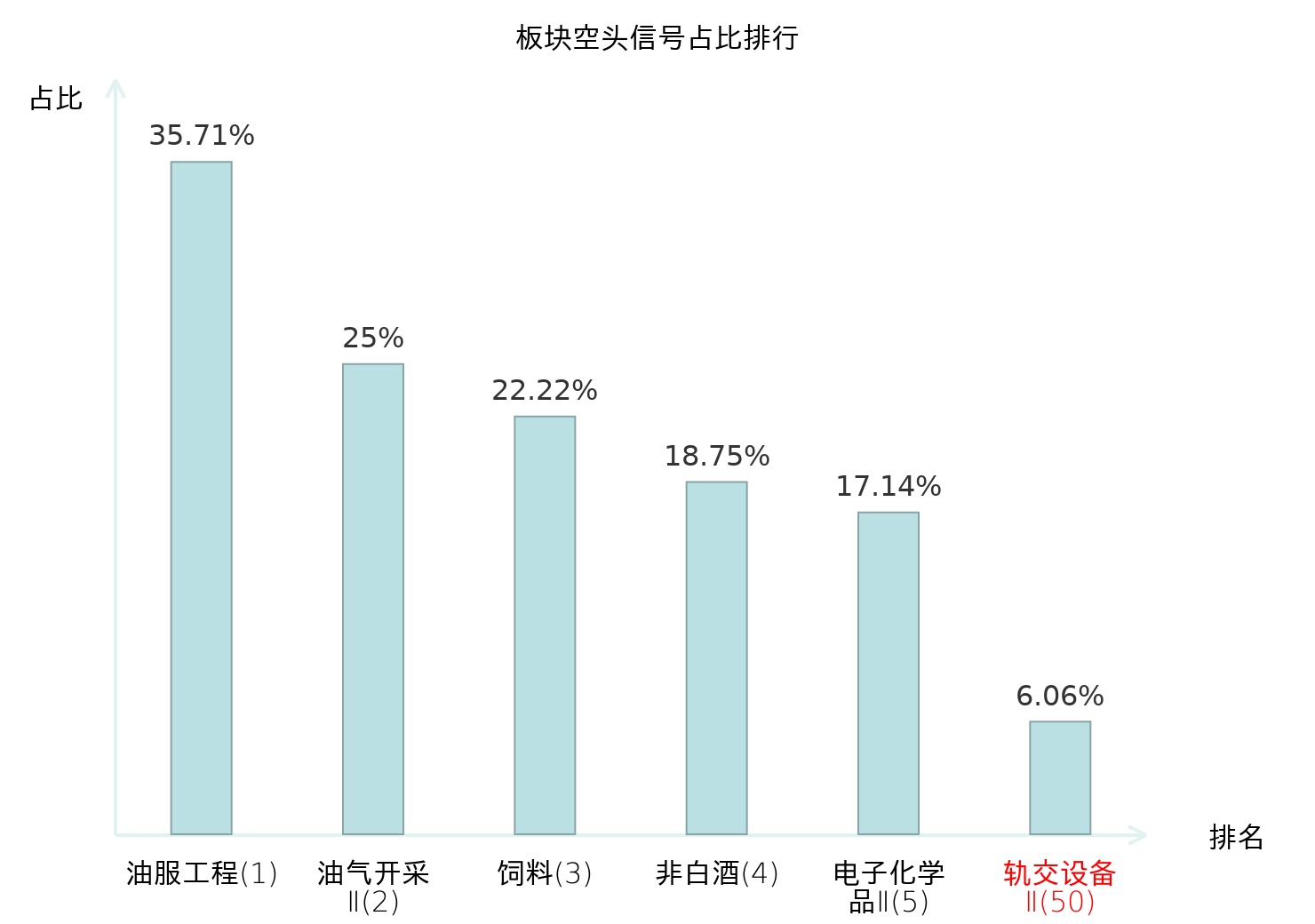 全市场所有行业板块中主力空头信号占比排名中,油服工程板块位居第一。电池板块名次提升最快,较昨日上升104位。