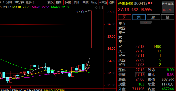 网络游戏概念股同样高开高走,板块指数放量涨近3%,创5年来新高。芒果超媒高开后快速20cm涨停,方正科技等亦强势涨停。