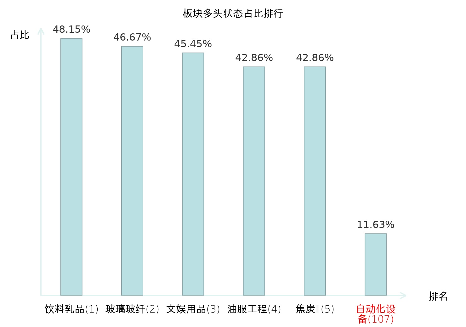 全市场所有行业板块中主力多头状态占比排名中,饮料乳品板块位居第一。商用车板块名次提升最快,较昨日上升77位。