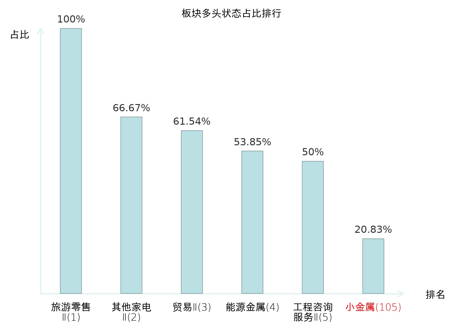 全市场所有行业板块中主力多头状态占比排名中,旅游零售Ⅱ板块位居第一。冶钢原料板块名次提升最快,较昨日上升37位。