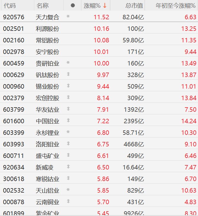 有色金属股狂欢!洛阳钼业、天山铝业、紫金矿业、江西铜业等纷纷创历史新高
