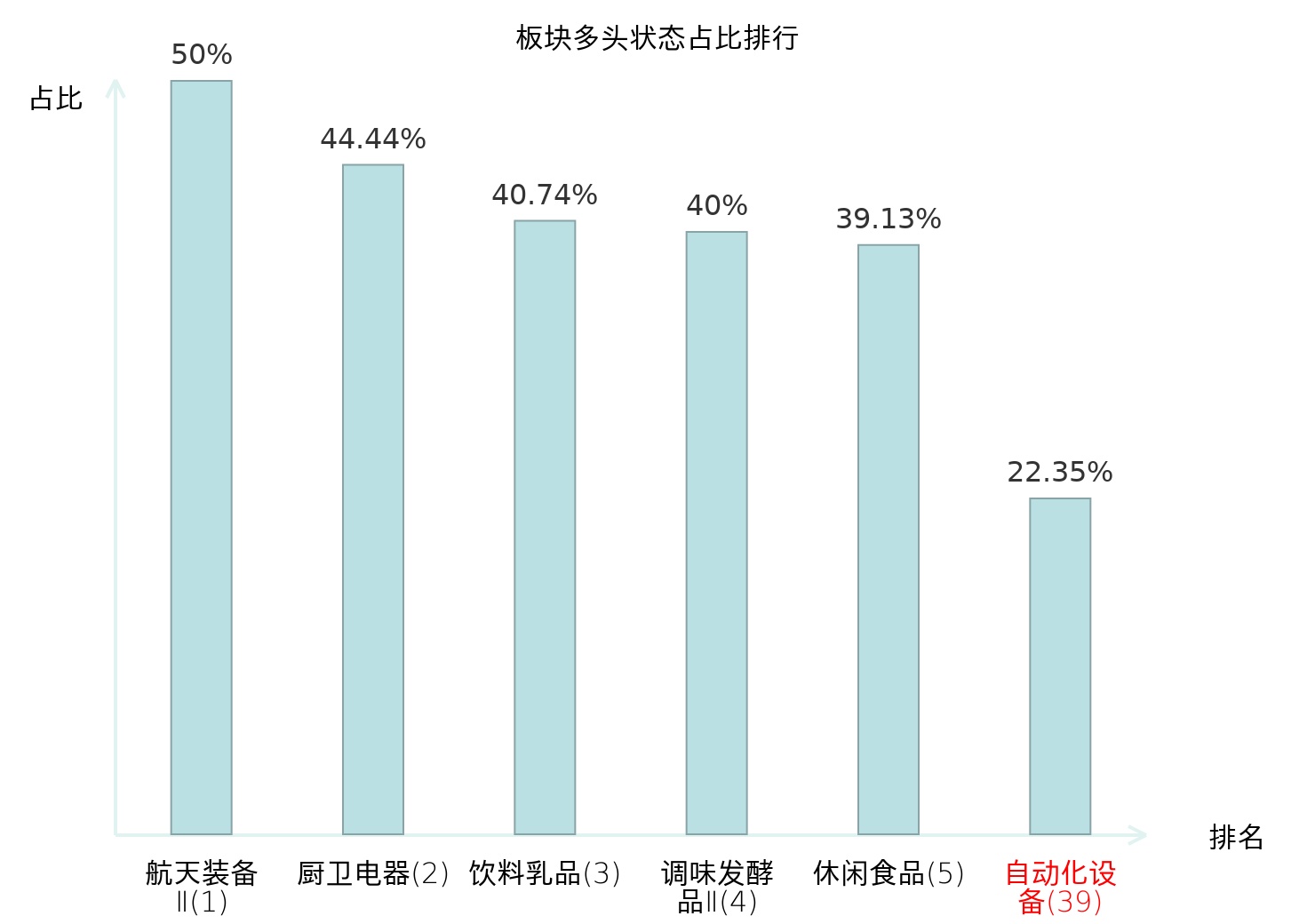 全市场所有行业板块中主力多头状态占比排名中,航天装备Ⅱ板块位居第一。林业Ⅱ板块名次提升最快,较昨日上升92位。