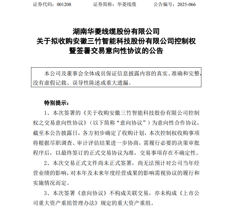 华菱线缆(001208)9月23日晚间公告,拟收购安徽三竹智能科技股份有限公司(简称“三竹智能”)控制权。后者生产的连接器是工业自动化、机器人、新能源等高端应用场景中的关键接口和“最后一环”,华菱线缆期望通过本次收购打造第二增长曲线。