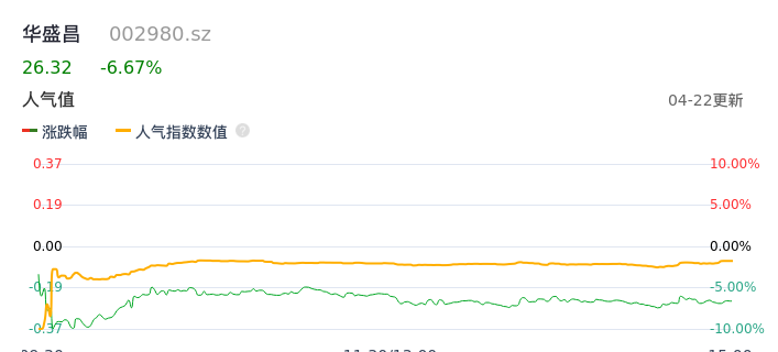 04月22日,华盛昌收报26.32,股价涨幅-6.67%,成交金额1.60亿元,换手率8.50%。