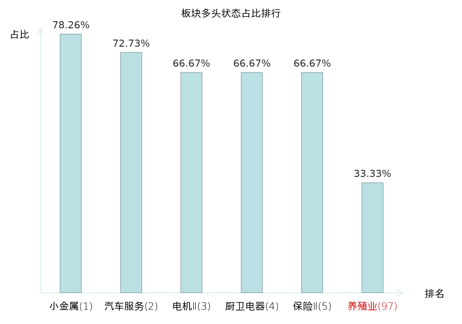 全市场所有行业板块中主力多头状态占比排名中,小金属板块位居第一。农业综合Ⅱ板块名次提升最快,较昨日上升88位。