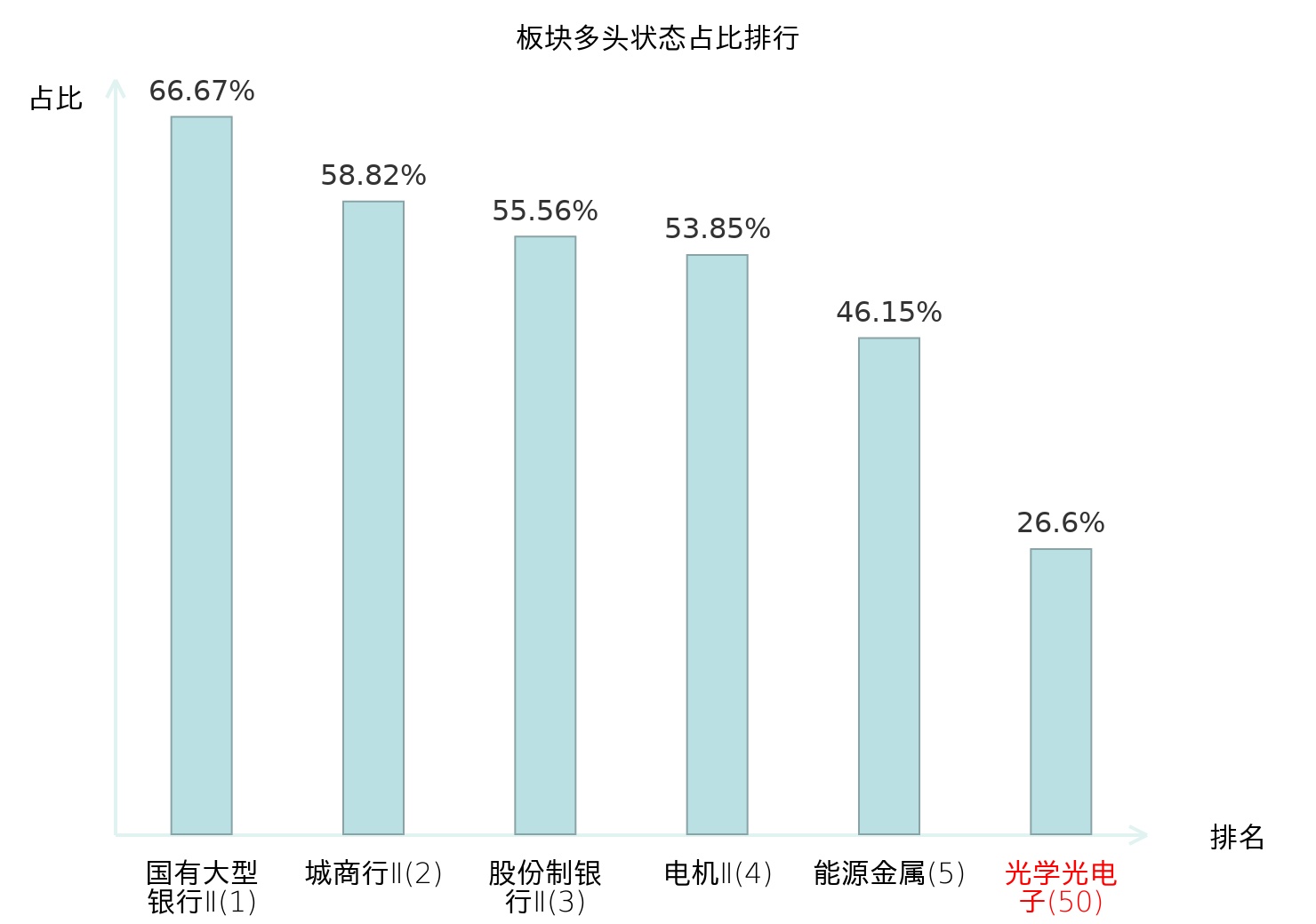 全市场所有行业板块中主力多头状态占比排名中,国有大型银行Ⅱ板块位居第一。自动化设备板块名次提升最快,较昨日上升57位。