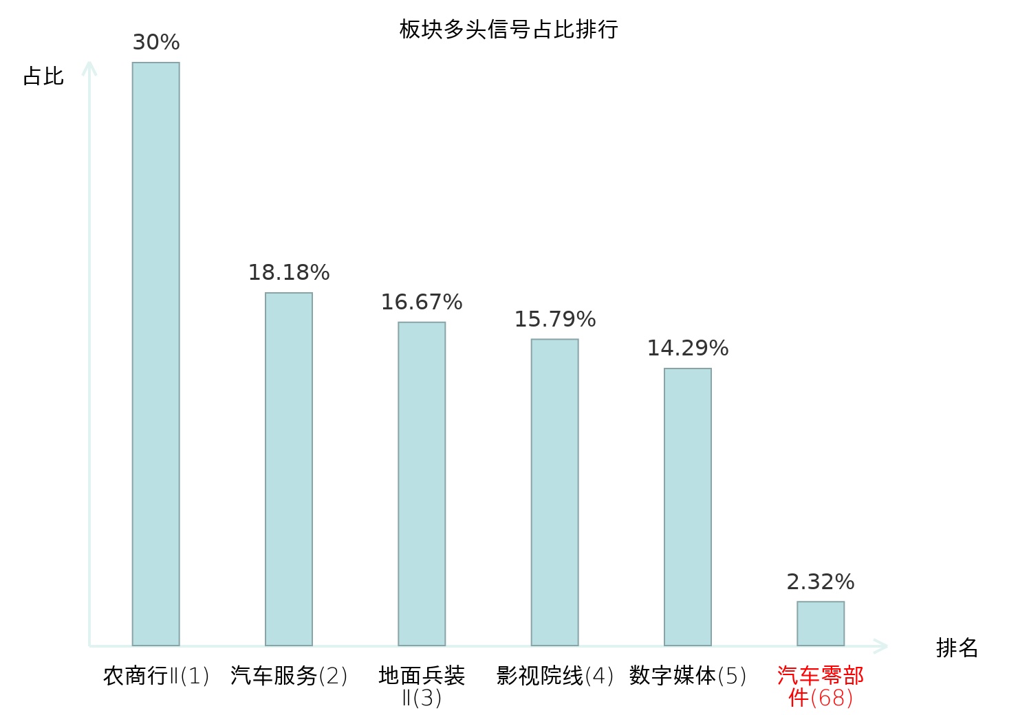 全市场所有行业板块中主力多头信号占比排名中,农商行Ⅱ板块位居第一。焦炭Ⅱ板块名次提升最快,较昨日上升115位。