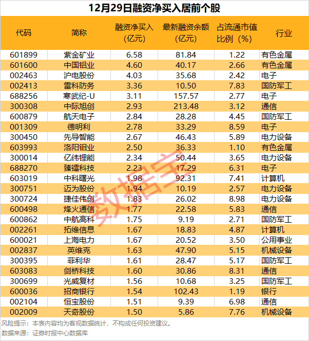 具体到个股,12月29日获融资净买入千万元以上的有575只,其中53只获融资净买入额超1亿元。紫金矿业融资净买入额居首,当日净买入6.58亿元。其次是中国铝业、沪电股份,融资净买入金额分别为4.60亿元、4.03亿元,融资净买入金额居前的还有雷科防务、寒武纪-U、中际旭创等。