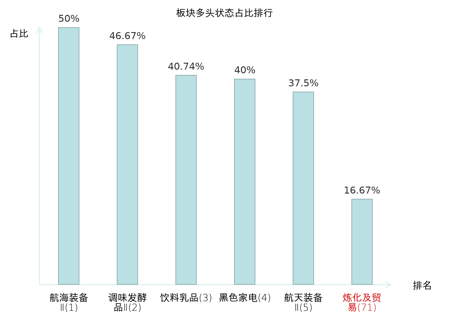全市场所有行业板块中主力多头状态占比排名中,航海装备Ⅱ板块位居第一。航海装备Ⅱ板块名次提升最快,较昨日上升99位。