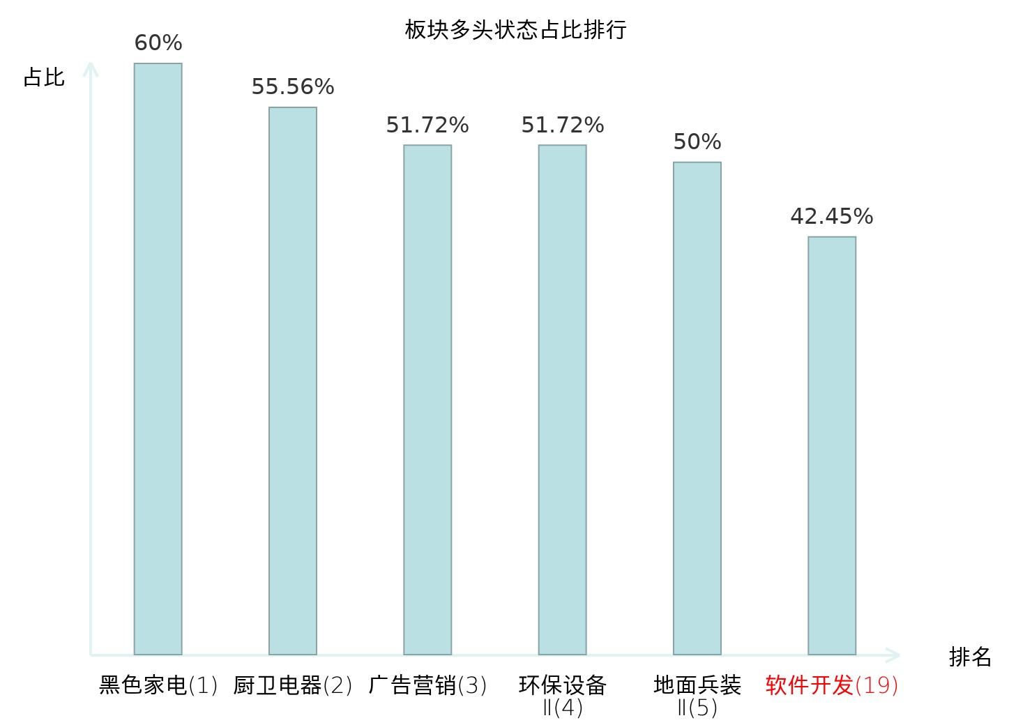 全市场所有行业板块中主力多头状态占比排名中,黑色家电板块位居第一。保险Ⅱ板块名次提升最快,较昨日上升118位。