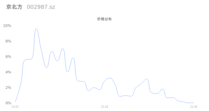 然后我们来看下当日成交的价格分布。将今天股票的最低价与最高价之差形成的价格区间进行切片,并画直方图进行分析,观察成交量在价格区间的分布情况。可以发现,当日的成交分布呈现左偏峰分布,这说明,该股票大部分成交集中在中位数以下,说明交易重心下降,近期可能会存在短线下跌风险。