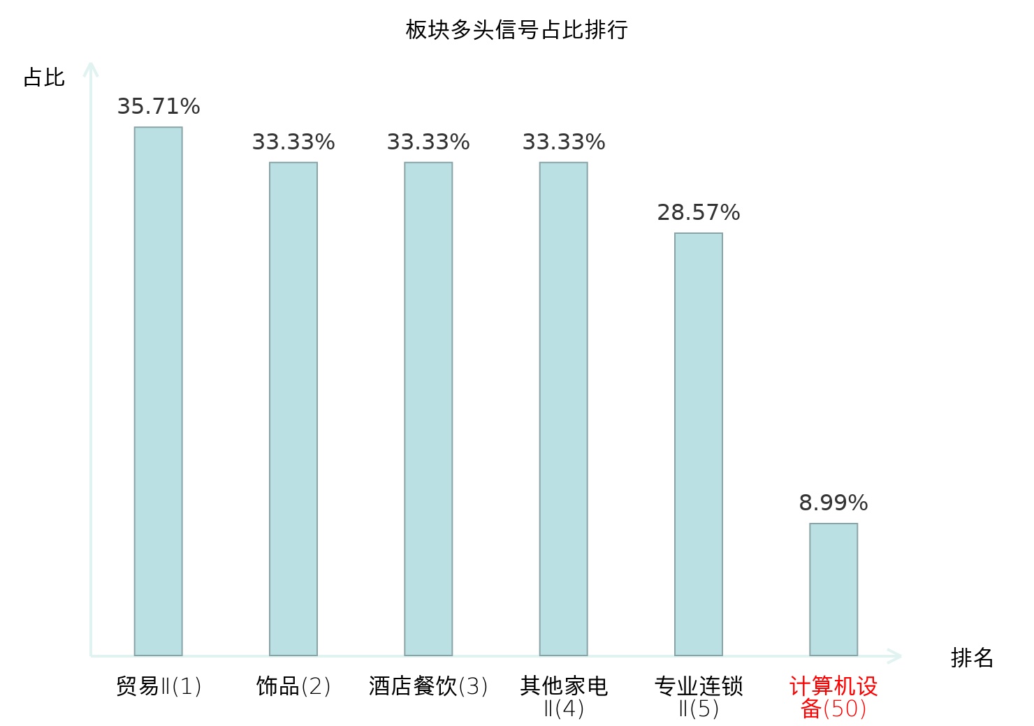 全市场所有行业板块中主力多头信号占比排名中,贸易Ⅱ板块位居第一。其他家电Ⅱ板块名次提升最快,较昨日上升125位。