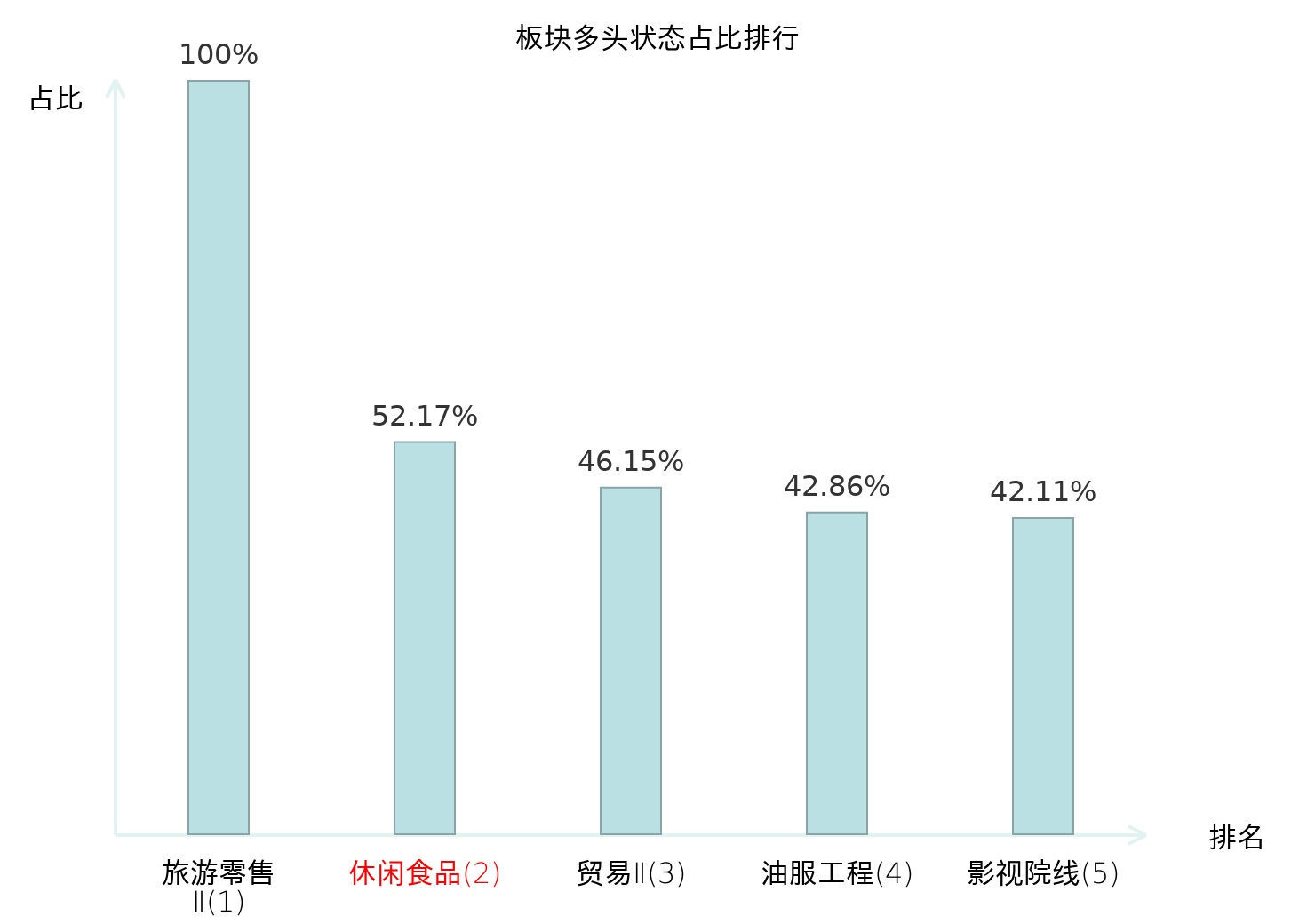 全市场所有行业板块中主力多头状态占比排名中,旅游零售Ⅱ板块位居第一。体育Ⅱ板块名次提升最快,较昨日上升99位。