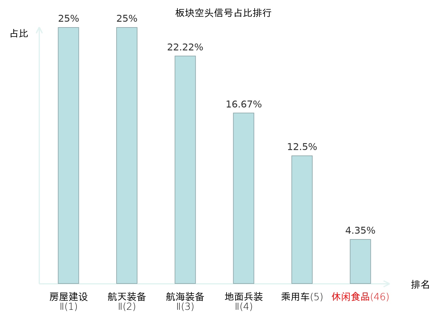 全市场所有行业板块中主力空头信号占比排名中,房屋建设Ⅱ板块位居第一。食品加工板块名次提升最快,较昨日上升110位。