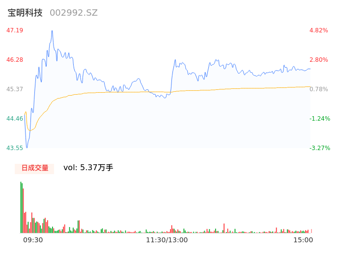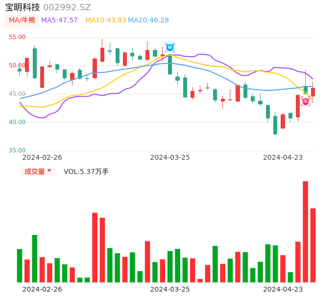 04月23日,宝明科技收报46.00,股价涨幅2.18%,成交金额2.44亿元,换手率6.85%。