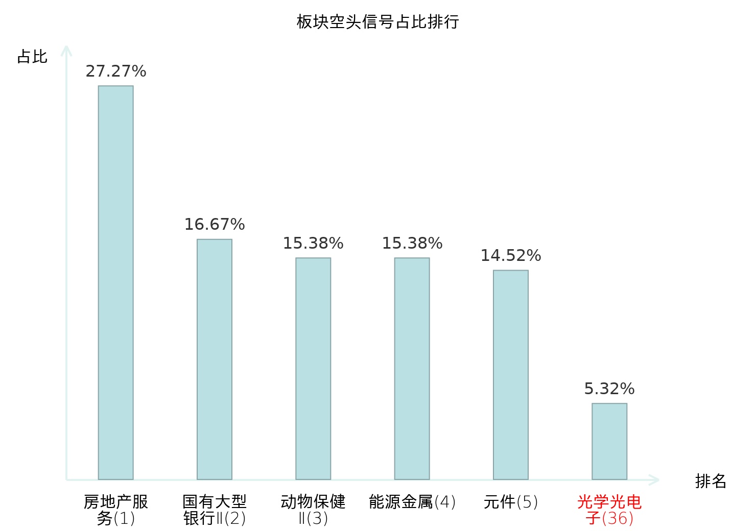全市场所有行业板块中主力空头信号占比排名中,房地产服务板块位居第一。元件板块名次提升最快,较昨日上升122位。