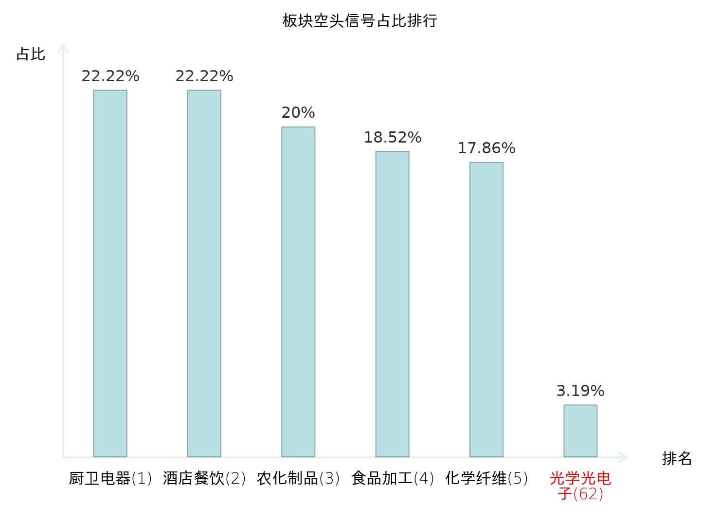 全市场所有行业板块中主力空头信号占比排名中,厨卫电器板块位居第一。化学纤维板块名次提升最快,较昨日上升119位。
