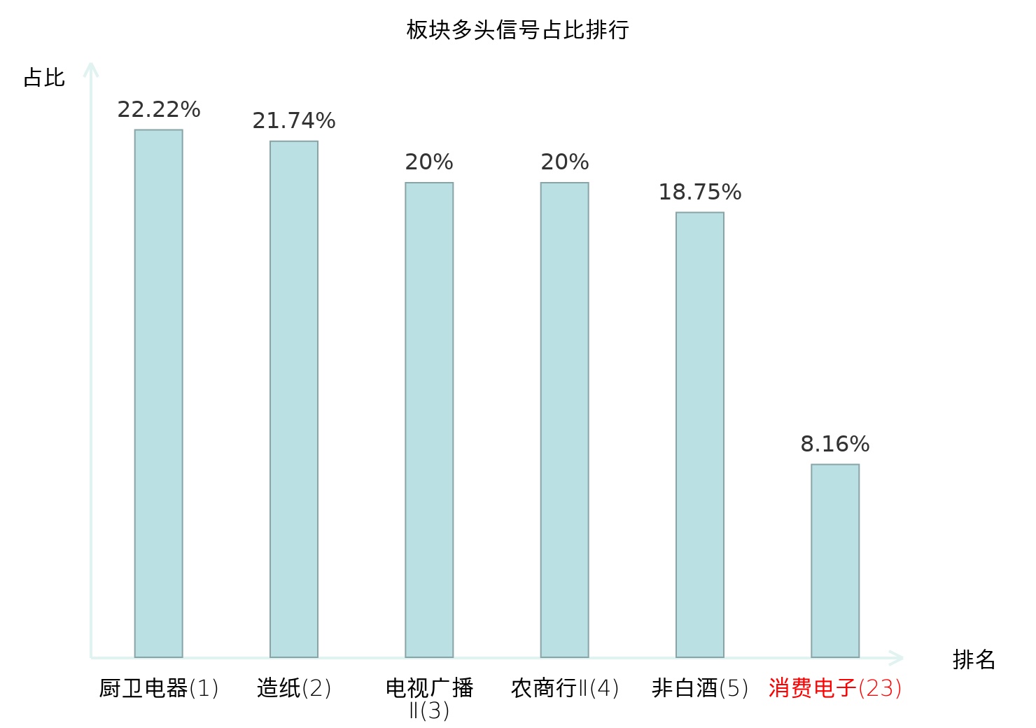 全市场所有行业板块中主力多头信号占比排名中,厨卫电器板块位居第一。厨卫电器板块名次提升最快,较昨日上升115位。