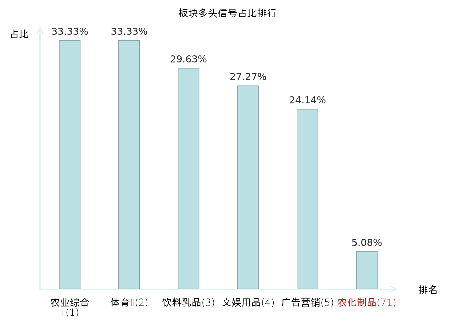 全市场所有行业板块中主力多头信号占比排名中,农业综合Ⅱ板块位居第一。体育Ⅱ板块名次提升最快,较昨日上升128位。