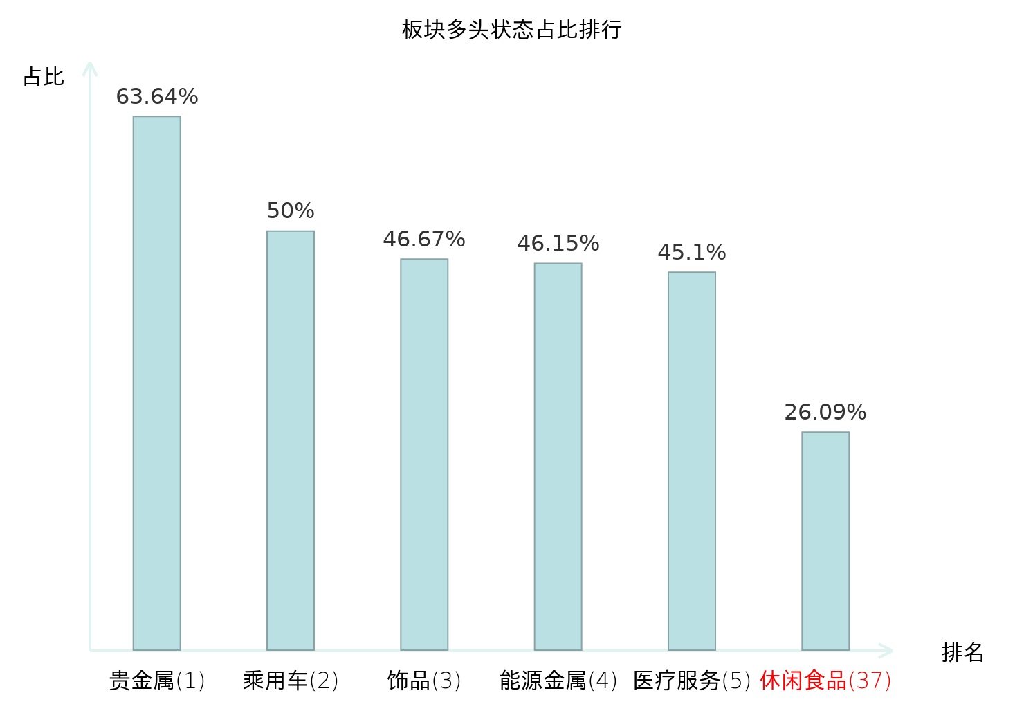 全市场所有行业板块中主力多头状态占比排名中,贵金属板块位居第一。电机Ⅱ板块名次提升最快,较昨日上升61位。
