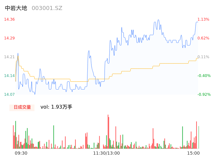 04月30日,中岩大地收报14.33,股价涨幅0.92%,成交金额2736.06万元,换手率3.93%。