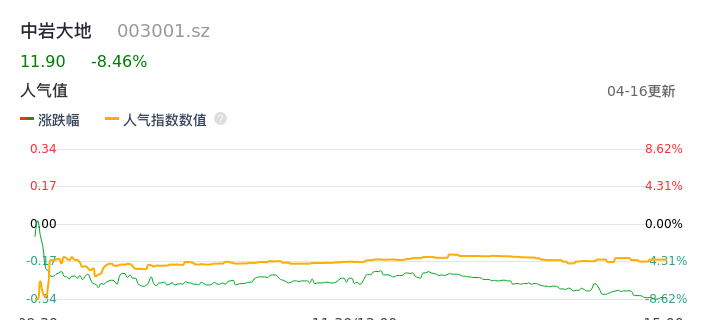 04月16日,中岩大地收报11.90,股价涨幅-8.46%,成交金额3192.89万元,换手率5.28%。
