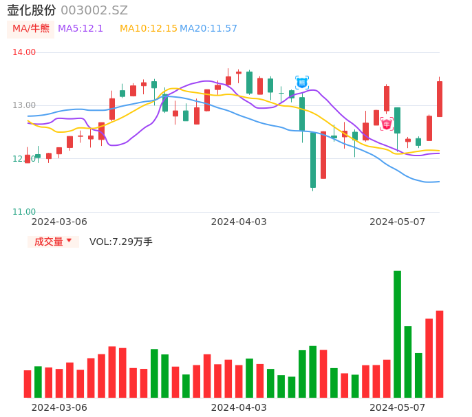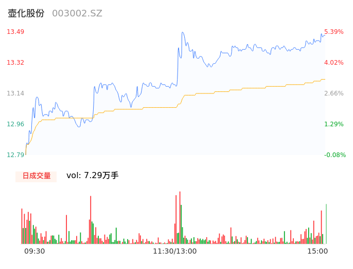 05月07日,壶化股份收报13.45,股价涨幅5.08%,成交金额9647.79万元,换手率3.99%。