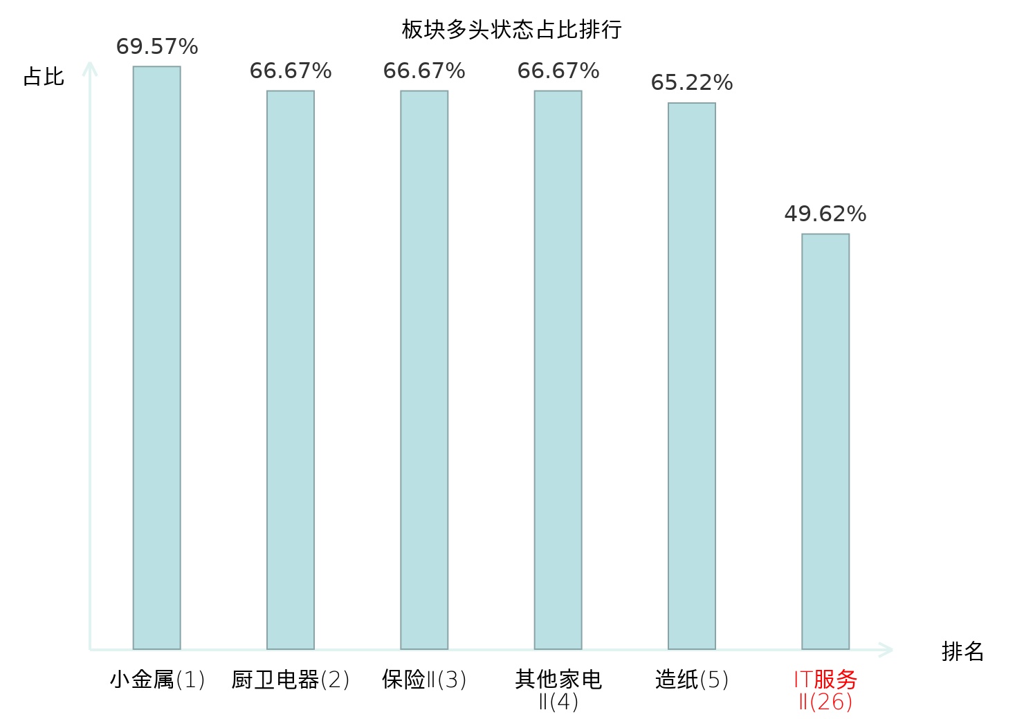 全市场所有行业板块中主力多头状态占比排名中,小金属板块位居第一。林业Ⅱ板块名次提升最快,较昨日上升86位。