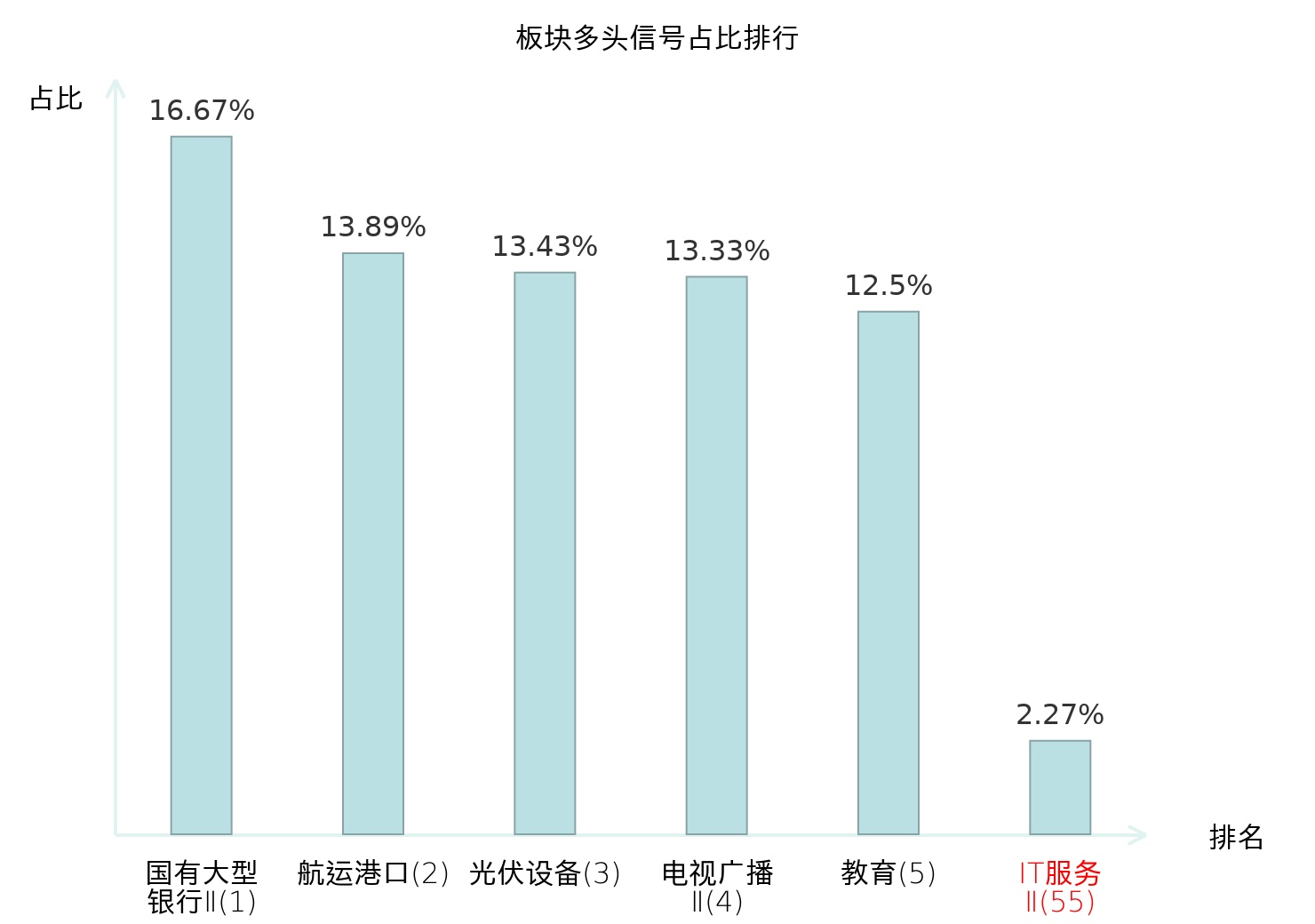 全市场所有行业板块中主力多头信号占比排名中,国有大型银行Ⅱ板块位居第一。国有大型银行Ⅱ板块名次提升最快,较昨日上升124位。