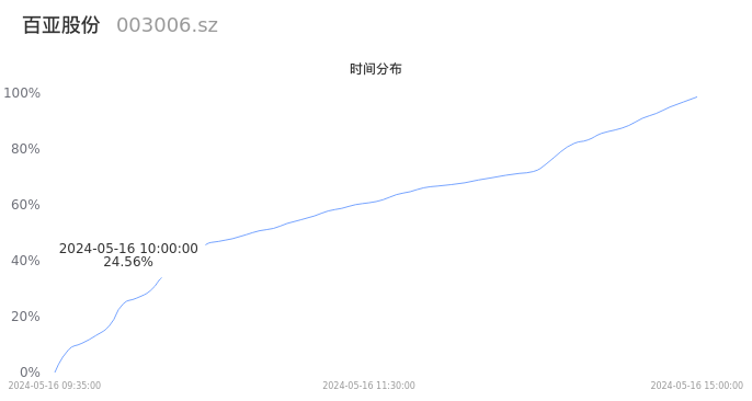 003006百亚股份2024年05月16日成交3.28万手,成交金额7797.81万元,相较昨日缩量8213手,换手率0.77%,成交清淡。