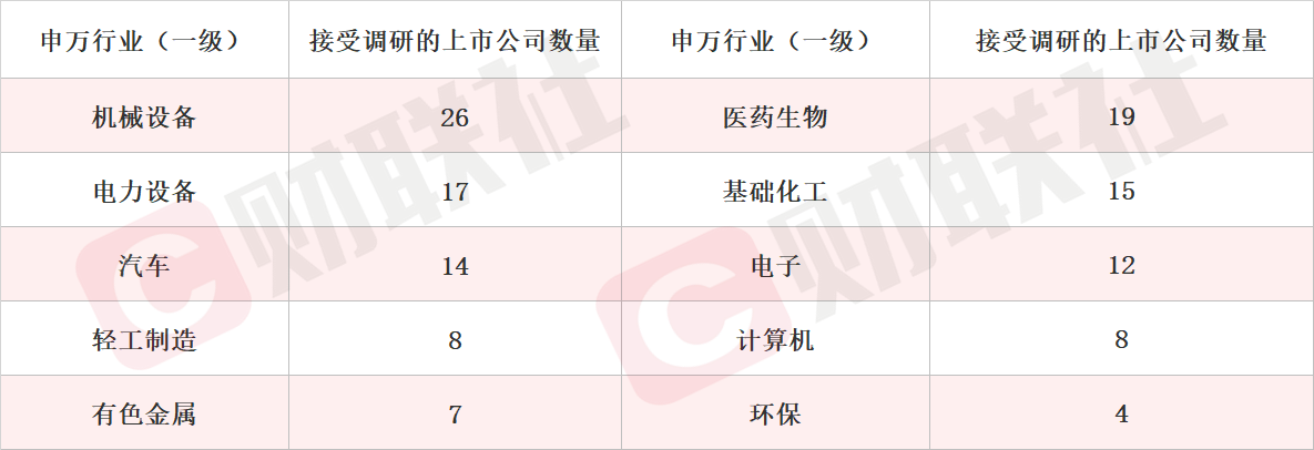 财联社10月26日讯(编辑 宣林)据Choice数据统计,截至今日,沪深两市本周共159家上市公司接受机构调研。按行业划分,机械设备、医药生物和电力设备行业接受机构调研频度最高。此外,汽车、环保等行业关注度有所提升。