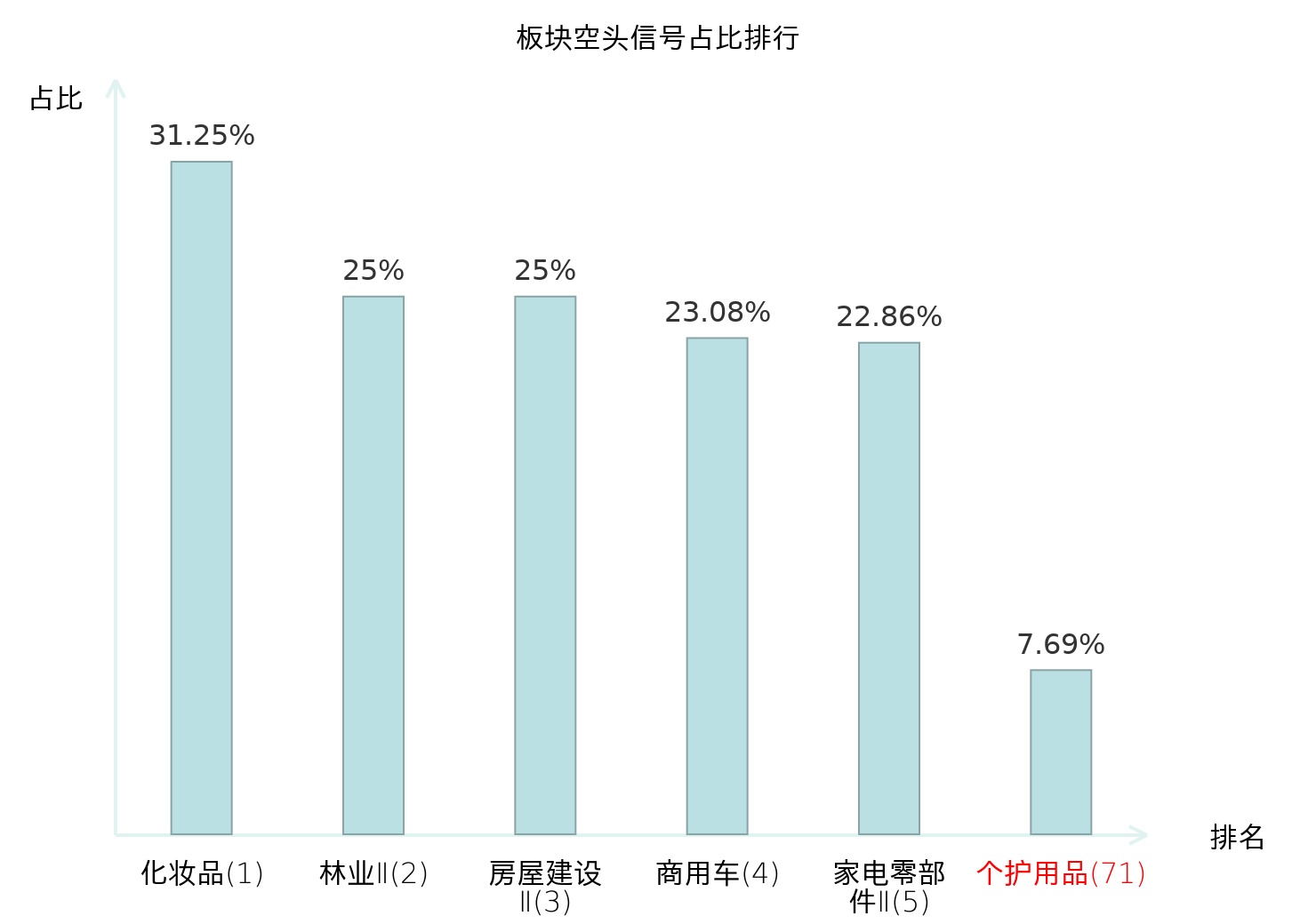 全市场所有行业板块中主力空头信号占比排名中,化妆品板块位居第一。房屋建设Ⅱ板块名次提升最快,较昨日上升113位。