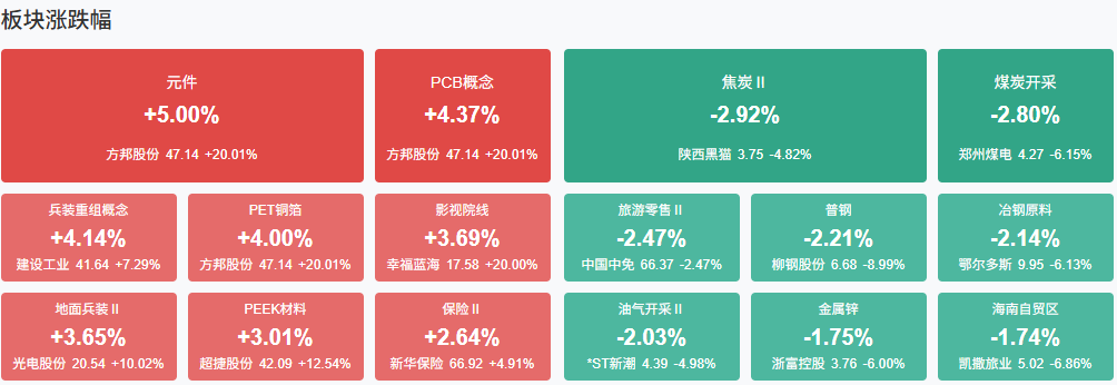 板块方面,PCB、影视、CPO、军工装备等板块涨幅居前,煤炭、钢铁、海南自贸区、贵金属等板块跌幅居前。截至收盘,沪指涨0.12%,深成指涨0.44%,创业板指涨0.96%。