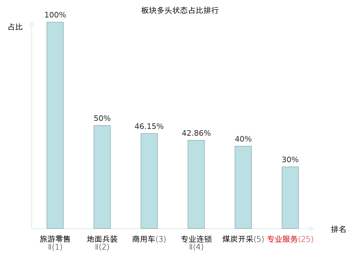 全市场所有行业板块中主力多头状态占比排名中,旅游零售Ⅱ板块位居第一。汽车服务板块名次提升最快,较昨日上升83位。