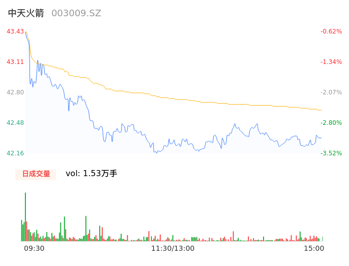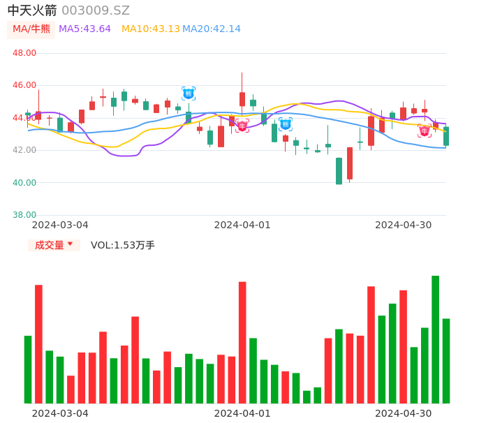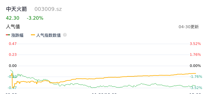 04月30日,中天火箭收报42.30,股价涨幅-3.20%,成交金额6503.73万元,换手率0.98%。