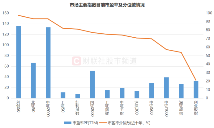 从估值层面来看,市场主要指数中,科创50、中证2000目前市盈率较高,且均超100倍,而红利指数、上证50、沪深300指数市盈率规模则相对靠后。若以近十年分位数情况统计,科创50、北证50、中证2000目前市盈率分位数均在90%以上,为近十年中较高位置,而创业板指分位数仅21.1%,深证成指、中证1000虽相对靠后,但分位数也均超50%。